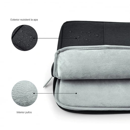 Exteriorul este resistent la apa, cu finisaje de calitate si interiorul este captusit cu catifea pentru protectie impotriva zgarieturilor si socurilor. Incarcatorul, mouse-ul orice adaptor se pot depozita in locasul de sus, acesta este prevazut cu fermoar.